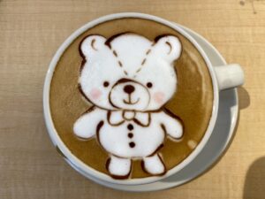 くまのラテアートやくまのぬいぐるみがかわいいカフェ。