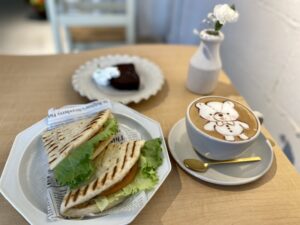 今回注文したメニューは・カフェラテ・ハム&チーズパニーニ・生ガトーショコラ。