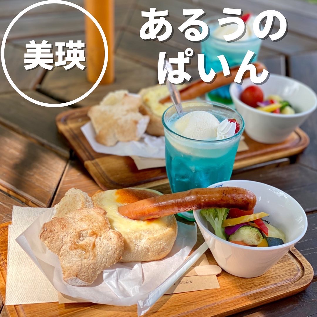 チーズがたっぷり盛られたトースト風天然酵母パンにソーセージが刺さってる映えな一品!