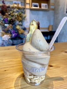 普通のソフトクリームと迷いましたが、焼き芋も食べたかったのでパフェにしました。黒糖と焼き芋が合わないはずがないですよね。このソフトクリームは黒糖の香りがとても好き。凄く美味しいです。焼き芋の紅はるかも甘くてソフトクリームとの相性ばっちりでした。