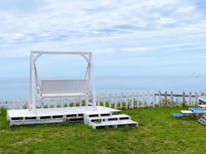 外のテラス席は開放的で海が見えるので人気。海の目の前にブランコもありますよ。