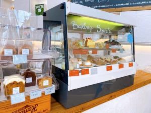 白基調のおしゃれな店内で、ジェラートはもちろん、限定メニューや焼き菓子も力を入れている。