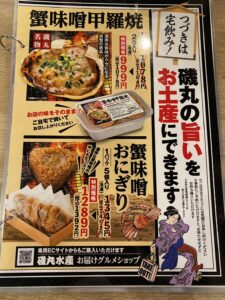 この日は「蟹味噌甲羅焼」が品切れでしたが1番人気のメニューだそうです。気になった方はぜひ。