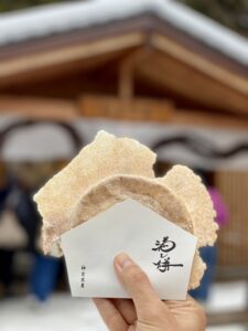 境内の食べ歩きは禁止されています。神宮茶屋内で食べてください。と注意書きが書いていました。ベンチで食べることができます。