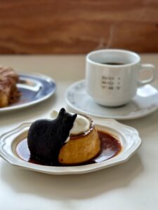 プリンは柔らかとろとろでクリーミー。こちらにも乗せてみた黒猫クッキーはブラックココアの味わい。