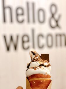 食べてみるとしんなりして噛むとしっとりな食感の焼き菓子にソフトクリームとチョコが乗っかっています。