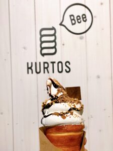 クルトシュは棒に生地を巻き付けて回転させながら焼き上げるハンガリーの焼き菓子。煙突のような筒状の生地から煙が立ち上がるような形をしている。