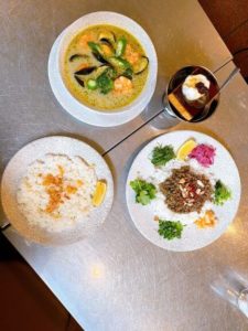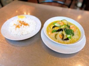 今回は「海老とムール貝のグリーンカレー」と「カスタードプリン」を注文。