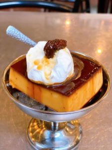 固めのむっちりプリンで上にクリームとラムレーズンが乗っています。プリンは大量のカラメルに埋まっていて、食べるとクリーミーで美味い。