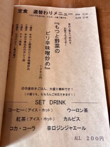 定食メニューすべてごはんや主菜の他、汁もの、小鉢2種付き。12:00~15:00。
