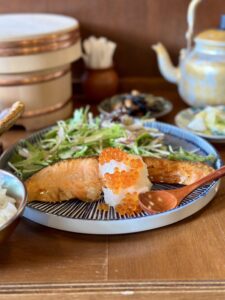 艶と粒が感じられる羽釜炊きごはん。ほんのり甘みが美味しい。銀鮭柔らかくて味付けも好き。イクラおろしで豪華なおかず。