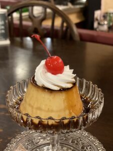 さくらんぼが乗ってるレトロな固めプリン。味はカラメル苦め、卵感強め。ホイップクリーム付けるとちょうどいい甘み。甘さ控えめで安心する味わい。