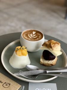 あんバターサンド、ブランマンジェフルーツ乗せ、ラテホットを選択。