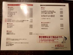 【ICE】・アイスコーヒー300円・アイスミルク200円・コーラ180円・レモン&ライムソーダ180円・オレンジジュース180円・アップルジュース180円・ウーロン茶180円・ラマイティー130円・ラマッシー200円・ココラマイ220円・ラマレモン220円(オススメ!)