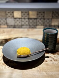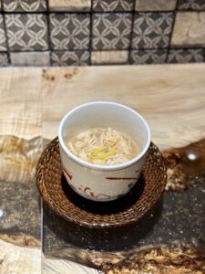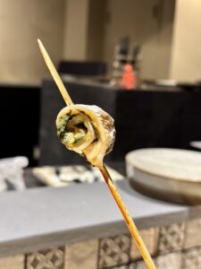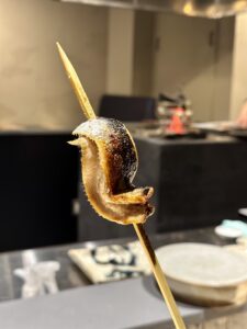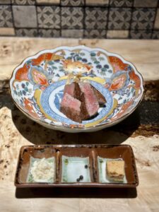 休ませながらじっくり炭で焼いたという白老牛は香りが違う。三種の薬味、山わさび、粒胡椒の塩漬け、泡醤油を付けて食べる。お肉が柔らかくて目をつぶって味わって食べてしまう。