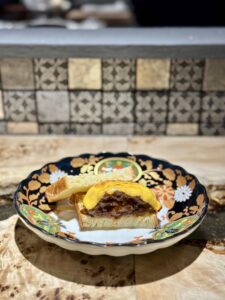 チーズハンバーグを自家製のデニッシュパンでいただく。