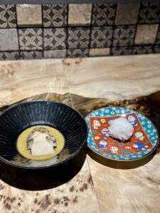 このあわびは柔らかい食感。あわびの肝とチーズを合わせたソースを酢飯に合わせてリゾットとして食べた。ドラえもんのお皿可愛い。