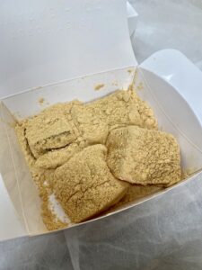 この生わらび餅はしっかり形が整っているので固めなのかな?と思っていたけど食べるととろっとろにとろけて凄く美味しい。きな粉と黒みつの相性も抜群!ここまで美味しいわらび餅が食べたことないぐらいです。