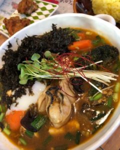 牡蠣ニラキーマ豆腐のスープカレーバラ海苔トッピング