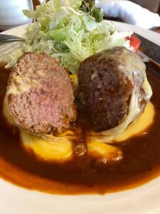 美しいげんこつ型のハンバーグにチーズがたっぷりかかっています!