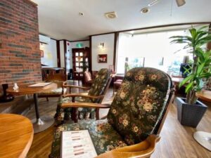 店内は10ぐらいのテーブル。暖炉の前2つがお一人様用。